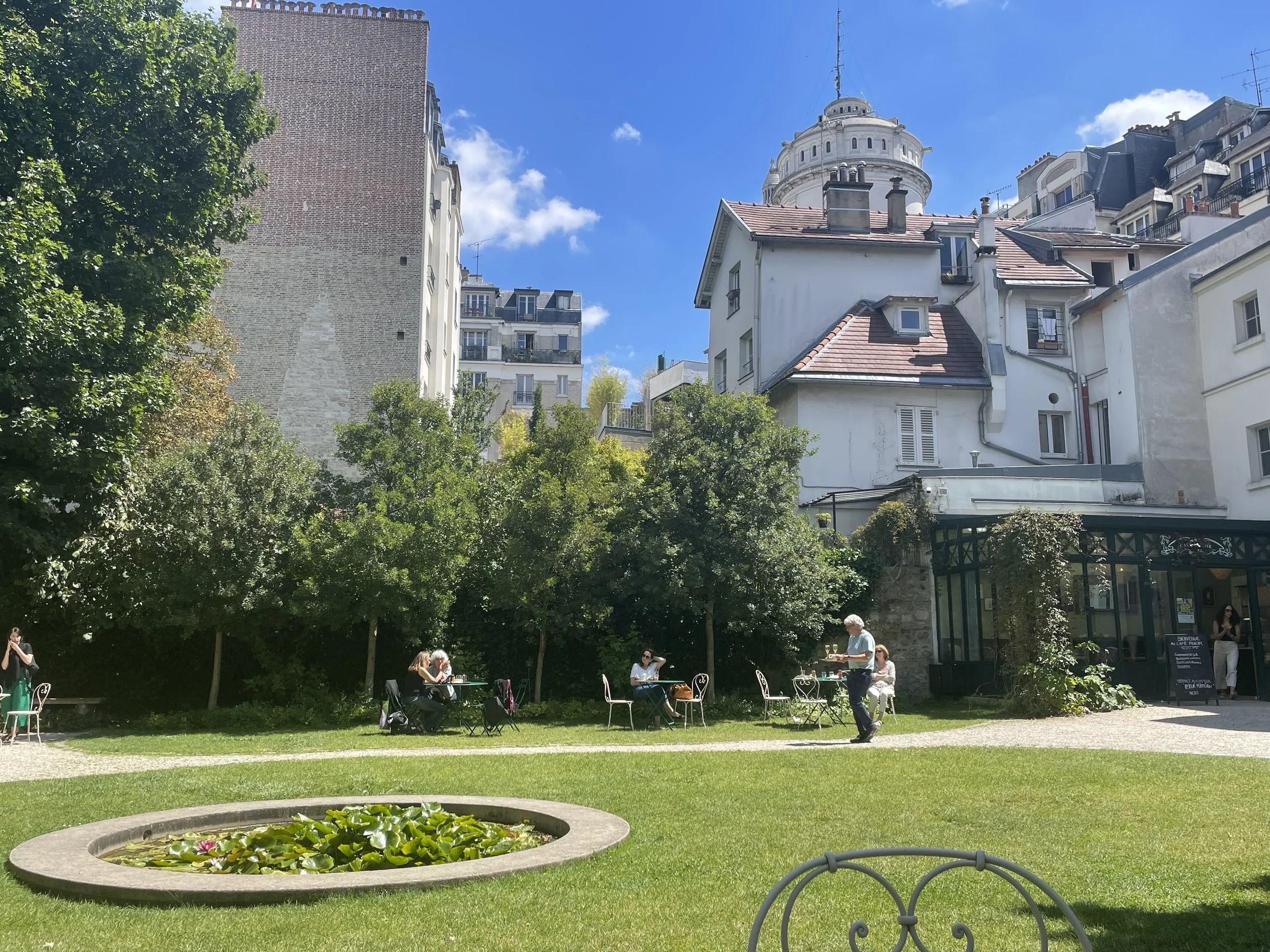 Lush green grass, soft and serene, with a pond in the middle and quaint cafe on the side. Circular tables were fixed around the pond. The garden dwellers sat in silence, each one with a book or a sketchpad. I felt like I had walked into a scene of that movie Midnight in Paris. If you continued beyond the tables there were paths that led into a small foresty area full of lone benches and tables, surrounded by plants and flowers. I sat and wrote poetry taking in the history of the grounds I sat on. This quiet, hidden patch of land in the center of the city.